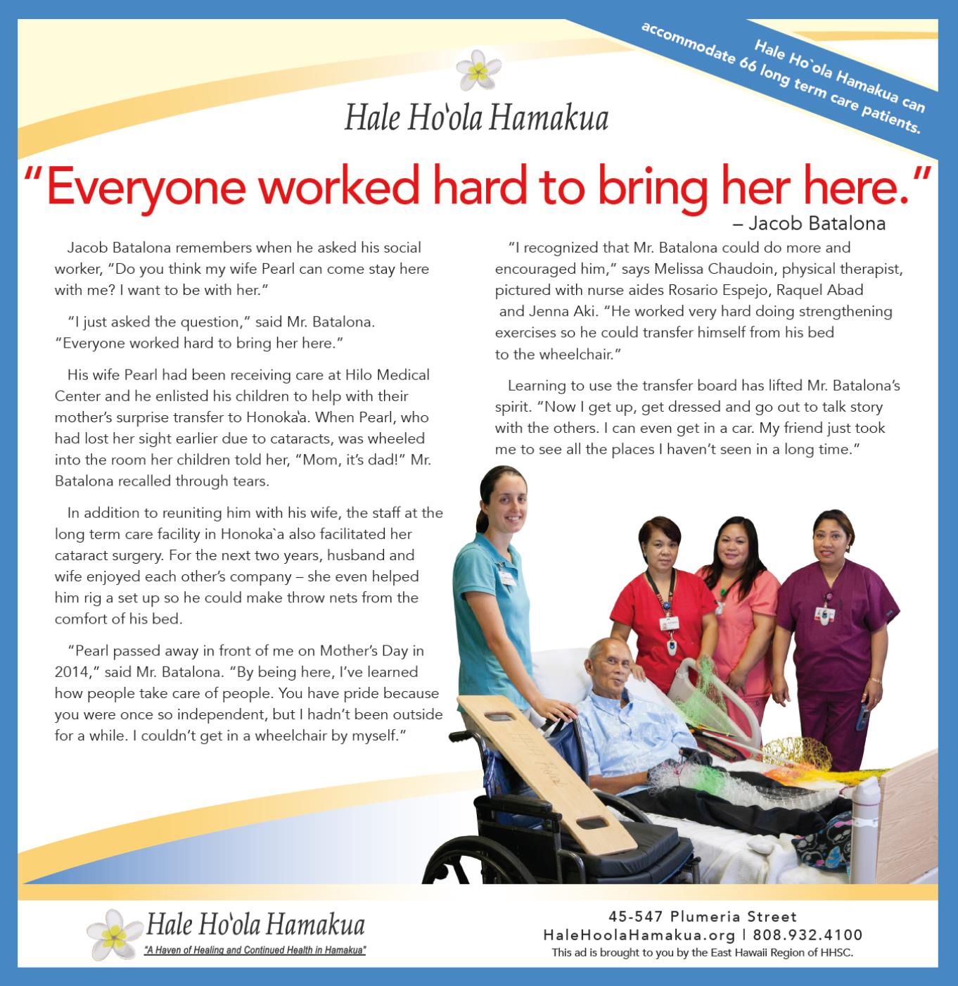 His wife Pearl had been receiving care at Hilo Medical Center and he enlisted his children to help with their mother’s surprise transfer to Honokaa. When Pearl, who had lost her sight earlier due to cataracts, was wheeled into the room her children told her, “Mom, it’s dad!” Mr. Batalona recalled through tears.